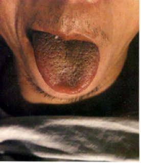 Description: Deep red and thin tongue, thick, yellow and dry coating